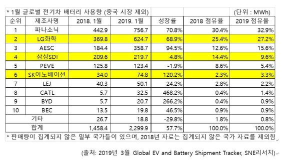 지난 1월에 판매된 글로벌 전기차(EV, PHEV, HEV)에 탑재된 비중국산(중국 시장 제외) 배터리 사용량 순위에서 한국의 LG화학과 삼성SDI가 각각 2위와 4위를 기록했다. SK이노베이션은 6위로 전년 동월 대비 한 계단 올라섰다. 이번에 집계된 배터리 사용량은 글로벌 배터리 사용량에서 중국에 출시된 전기차에 탑재된 중국산 배터리 사용량을 제외한 것이다.