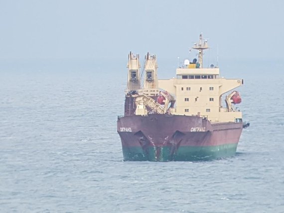9일 부산 외항에 정선 중인 씨그랜드호 모습. 광안대교와의 충돌로 선수부 구조물이 무너져 있다. / 사진=조용진