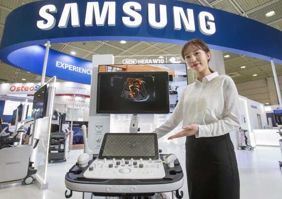 삼성전자 모델이 14일 서울 삼성동 코엑스에서 개최된 '제35회 국제의료기기·병원설비전시회(KIMES)'에서 프리미엄 초음파 진단기기 플랫폼 신제품 ‘HERA W10’을 선보이고 있다. /삼성전자 제공