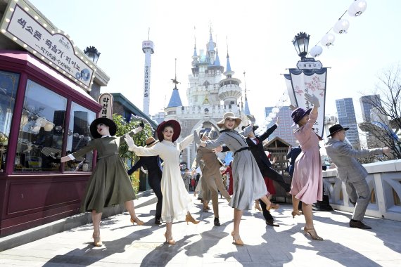 롯데월드 어드벤처는 24일 서울 송파구 롯데월드에서 봄 시즌 축제 '개화기' 오픈을 기념해 과거 '개회기'시대 서울 거리를 재현한 매직 아일랜드 캐슬로에서 플래시몹 퍼포먼스를 하고 있다. 롯데월드 어드벤처는 6월 23일까지 꽃이 피는 시기 '개화기'에 떠나는 시간여행을 콘셉트로 다양한 즐길 거리를 선 보였다. 사진=박범준 기자