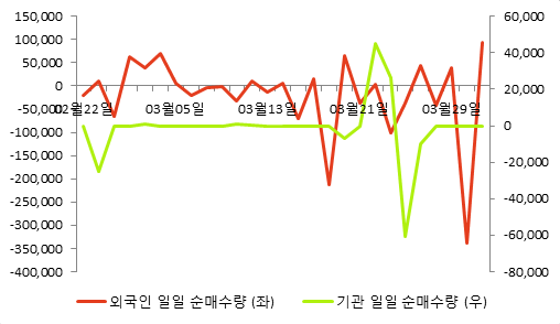 다음 표는 동종목의 외국인, 기관의 일별 순매수량을 나타낸 것이다.