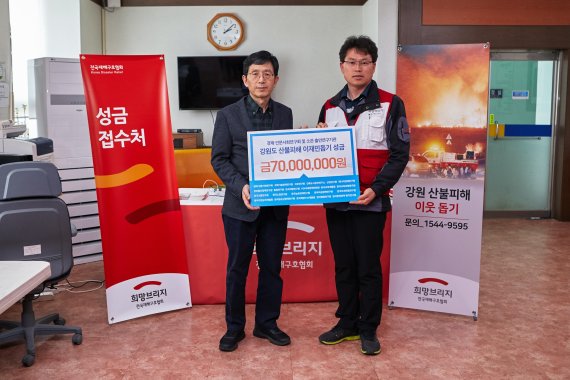 성경륭 경제·인문사회연구회 이사장은 23일 강원도 속초의 전국재해구호협회 고성 현장접수처를 방문해 연구회 및 21개 소관 연구기관 임직원의 뜻을 모아 7000만원을 산불 이재민돕기 성금을 기탁했다. 이재민의 재활에 힘을 보태기 위해 '경제·인문사회연구회 및 연구기관 임직원 일동'으로 전국재해구호협회에 성금을 전달했다. 성 이사장(왼쪽)이 연구회 및 소관 연구기관을 대표해 산불이재민 돕기 성금을 기탁한 후 기념촬영을 하고 있다.