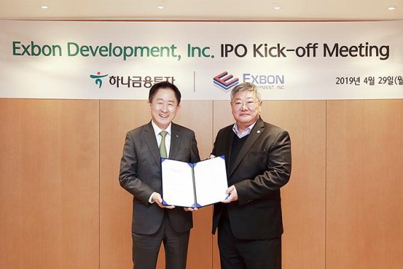 하나금융투자는 미국 건설사 엑스본(Exbon Development, Inc.)과 코스닥시장 상장을 위한 킥오프 미팅을 가졌다고 4월 30일 밝혔다. 앞서 하나금융투자와 엑스본은 오는 2020년 하반기 코스닥 상장(IPO)을 목표로 상장주관계약을 체결한 바 있다.
