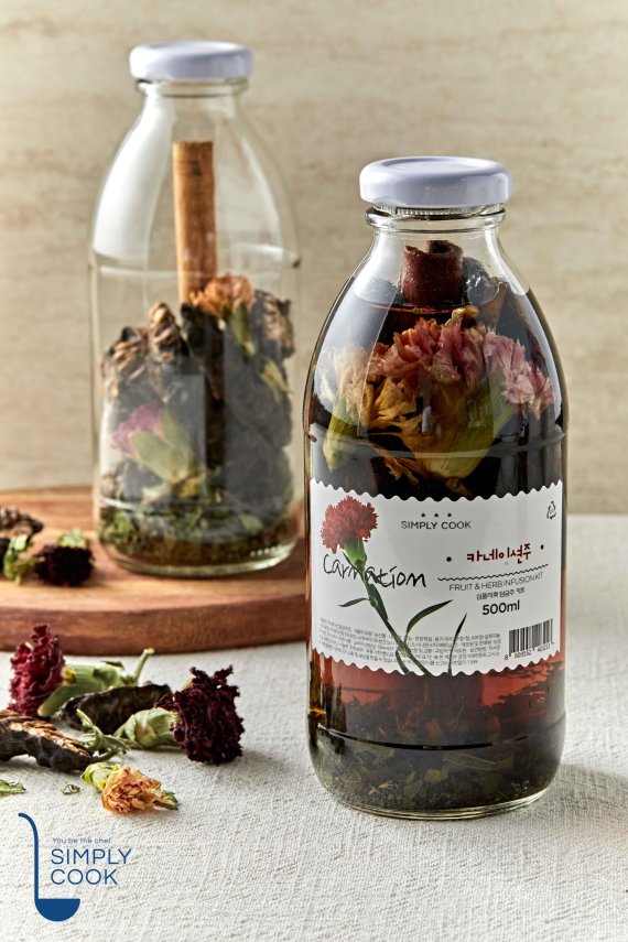 어버이날하면 떠오르는 카네이션을 콘셉트로, 최근 20~40대 사이에 선물용으로 인기를 끌고 있는 담금주에서 상품의 아이디어를 찾았다고 심플리쿡은 전했다.