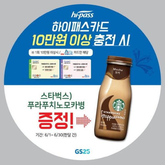 SM하이플러스㈜(대표 최승석) 선불하이패스카드가 GS25편의점에서 고액을 충전하는 고객을 대상으로 스타벅스 프라프치노 모카병을 증정하는 이벤트를 진행한다.