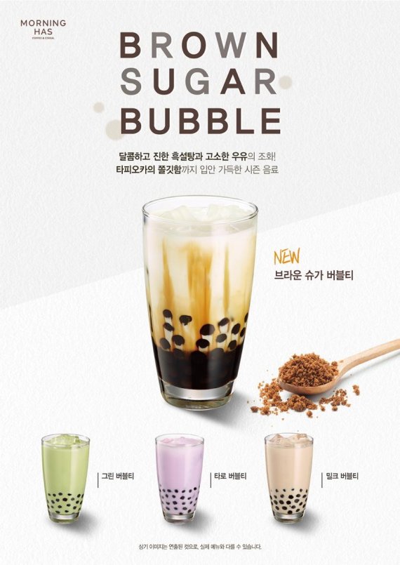 이번에 '모닝해즈'에서 선보이는 음료는 '브라운 슈가 라떼', '브라운 슈가 버블티' 등 총 5종이다.