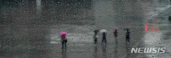 부산지역에 올해 첫 장맛비가 내린 지난 26일 오후 해운대구 벡스코 야외광장을 찾은 시민들이 우산을 쓴 채 걸어가고 있다. / 사진=뉴시스