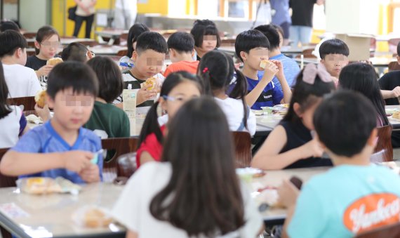학교 비정규직 노동자들이 총파업에 나선 3일 오후 서울의 한 초등학교 급식실에 대체 급식을 먹기 위해 내려온 학생들이 텅 빈 배식대 앞을 지나가고 있다.사진=박범준 기자