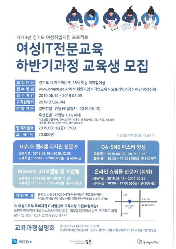 【수원=장충식 기자】 경기도일자리재단은 ‘여성IT직업훈련과정’ 하반기 교육생 120명을 모집한다고 9일 밝혔다.