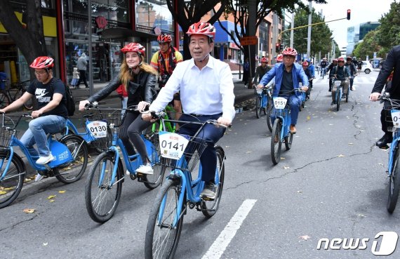 중남미를 순방 중인 박원순 서울시장이 14일(현지시간) 콜롬비아 보고타의 '시클로비아(Ciclovia)' 현장에서 보고타 시민들과 자전거를 타고 있다. 시클로비아는 세계에서 가장 큰 규모의 차 없는 거리로 운영되고 있다. (서울시 제공) 2019.7.15/뉴스1 /사진=뉴스1화상