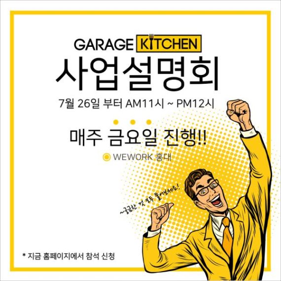 또한 개러지키친 서울 Hub를 신설해 컨설팅 서비스, 공유오피스, 오픈마켓, 교육 등 입점 브랜드들이 다양한 부가서비스를 이용할 수 있게 할 예정이다.
