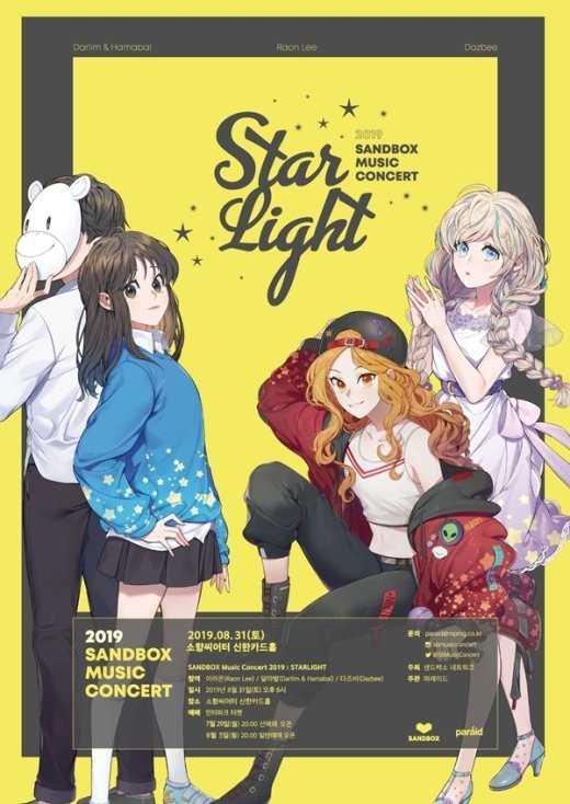 MCN 엔터테인먼트 기업 샌드박스 네트워크가 주최하는 'SANDBOX Music Concert 2019(샌드박스 뮤직 콘서트 2019)'가 티켓 오픈과 동시에 매진을 기록했다.'샌드박스 뮤직 콘서트 2019'는 예스이십사 라이브홀에서 오는 8월 24일, 25일 양일 진행될 예정이다.'샌드박스 뮤직 콘서트 2019' 공연 라인업은 유튜브 뮤직 크리에이터인 이라온, 다즈비, 달마발로 구성돼 있으며 이들은 모두 샌드박스 네트워크에 소속된 국내의 대표적인 뮤직 크리에이터다.