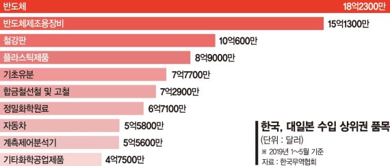 대일본 수입비중이 70% 이상으로 의존도가 품목은 2018년 기준 석유화학 중간원료(98.8%), 자일렌(95.4%), 수치제어반(91.3%), 기타 사진영화용재료(87.5%), 평판디스플레이 제조용 장비(82.7%), 톨루엔(79.3%), 철 및 비합금강중후판(74.7%), 빌레트(74.6%), 광택제(74.3%), 도료(70.8%) 등이 있다.