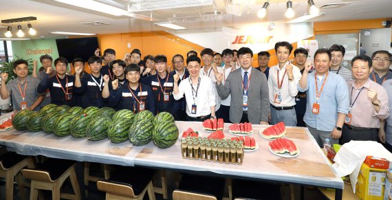 말복을 앞둔 8월9일 오후 제주항공 정비사라운지에서 조종사노조 소속 조종사들과 정비사들이 수박나눔 행사를 갖고, 안전운항을 다짐하고 있다. /제공=제주항공