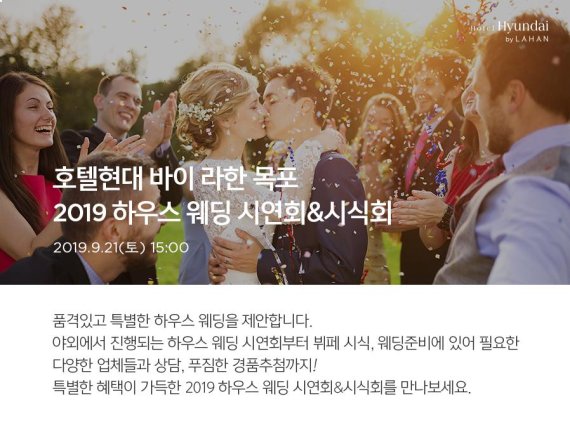이현소 호텔현대 바이 라한 목포 총지배인은 “하우스 웨딩이 진행되는 호텔 앞 잔디광장은 탁트인 뷰와 자연을 배경으로 낭만적인 야외 웨딩을 꿈꾸는 신혼부부를 위한 장소로 제격”이라며 “다양한 정보와 혜택이 마련되는 이번 행사에서 나만의 웨딩을 위한 유익한 시간을 보내시기 바란다”고 말했다.