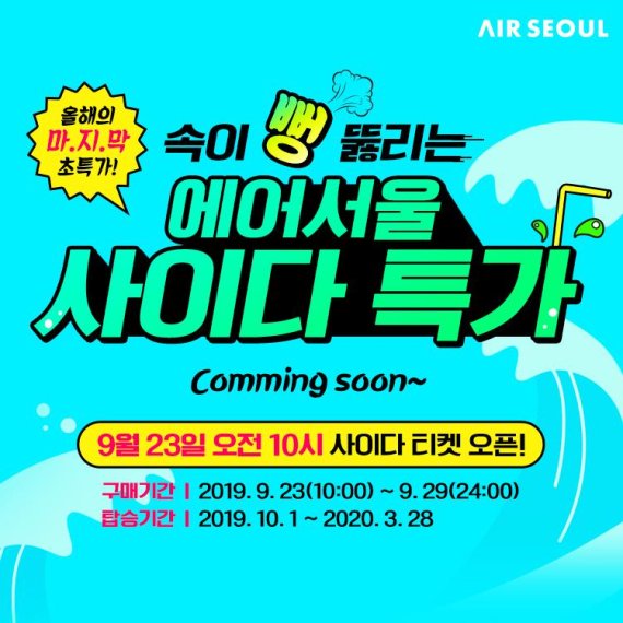 [파이낸셜뉴스] 에어서울이 오는 23일 오전 10시부터 에어서울 특가 중 가장 큰 규모의 정기 세일 '사이다 특가'를 실시한다고 17일 밝혔다.