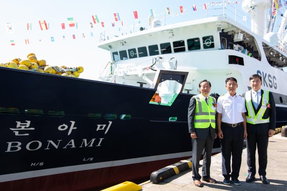 동원산업 본아미호 출항식에서 (왼쪽부터) 이명우 동원산업 사장, 최윤진 본아미호 선장, 김남정 동원그룹 부회장이 24일 부산 다대항에서 기념촬영을 하고 있다.