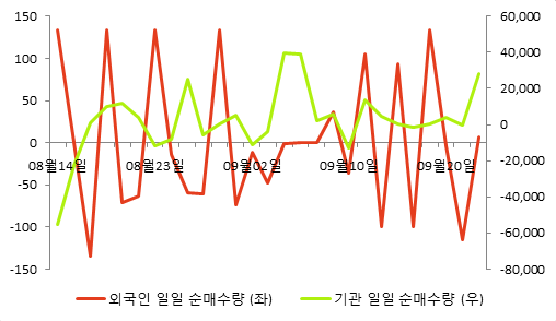 다음 표는 동종목의 외국인, 기관의 일별 순매수량을 나타낸 것이다.
