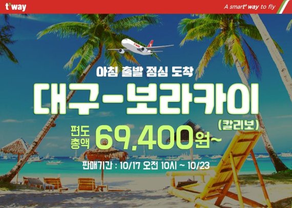 [파이낸셜뉴스] 티웨이항공이 이달 말 대구에서 출발하는 필리핀 보라카이(칼리보) 노선 신규 취항을 앞두고 특가 판매 이벤트를 실시한다.