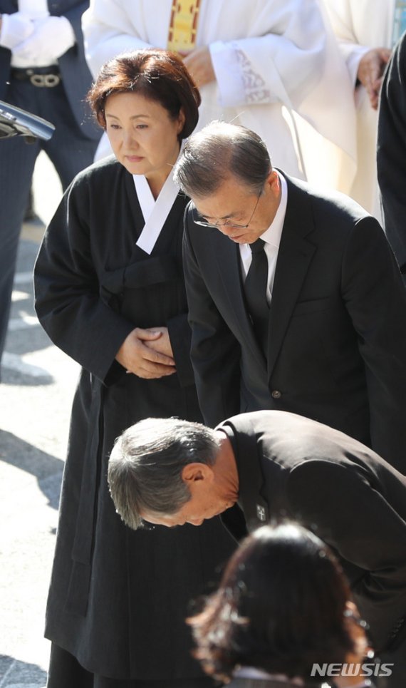 【부산=뉴시스】배훈식 기자 = 문재인 대통령이 31일 오전 부산 수영구 남천성당에서 모친 故 강한옥 여사 운구를 따르며 마지막 인사를 하고 있다. 왼쪽은 김정숙 여사. 2019.10.31. dahora83@newsis.com <저작권자ⓒ 공감언론 뉴시스통신사. 무단전재-재배포 금지.> /사진=뉴시스화상