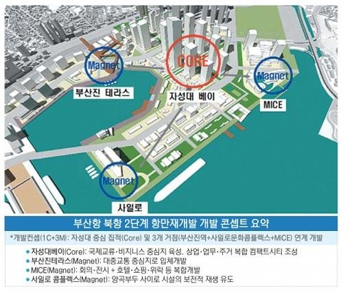 지금의 자성대부두를 중심축으로 '자성대베이(Core)'는 24시간 활동하는 국제교류·비지니스 중심지로 육성한다는 것이다. 자성대부두 서측인 '부산진테라스(Magnet)'는 대중교통 중심지로 입체 개발한다. 자성대부두 북측인 'MICE(Magnet)'는 회의·전시와 호텔·쇼핑·위락시설 등으로 복합 개발한다.