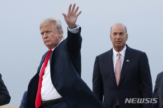 【브뤼셀(벨기에)=AP/뉴시스】지난 2018년 7월10일 벨기에 브뤼셀에 도착한 도널드 트럼프 미 대통령(왼쪽) 뒷편에 고든 선들랜드 유럽연합(EU) 주재 미국 대사의 모습이 보이고 있다. 선들랜드 대사의 변호인은 8일 미 국무부가 선들랜드에게 트럼프 대통령에 대한 하원 3개 위원회의 탄핵 조사에 증언하지 말도록 지시했다고 밝혔다. 2019.10.8