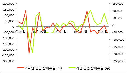 기관투자자 연속 0일 순매도최근 5일간 동종목의 외국인 투자자는 159,502주 순매도하였고 반면 기관은 8,616주 순매수하였다.