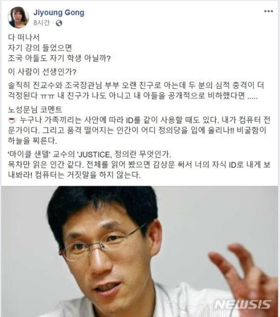 공지영은 15일 자신의 SNS에 "다 떠나서 자기 강의 들었으면 조국 아들도 자기 학생 아닐까? 이 사람이 선생인가"라며 글을 올렸다.
