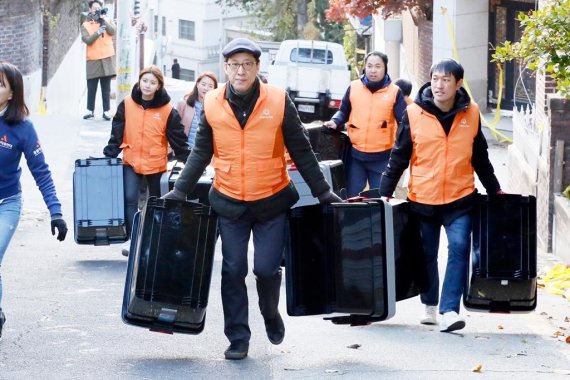 한화갤러리아 김은수 대표(가운데) 등 임직원 봉사단 11명은 19일 서울시 서초구에 위치한 재건축 단지를 방문, 길고양이 50여 마리의 안전한 겨울나기를 위한 겨울집 및 고양이 급식소 50채를 설치하고 항생제와 사료를 지원하는 ‘길고양이 생명존중 사회공헌 활동을 진행했다.