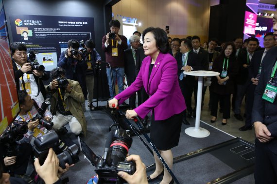 박영선 중소벤처기업부 장관이 25일 부산 벡스코에서 열린 한·아세안 특별정상회의 부대행사로 열리는 ‘한·아세안 스타트업 엑스포 컴업(ComeUp)’에 참석해 국내 스타트업 제품을 시연하고 있다.