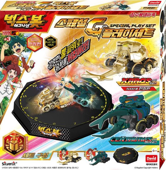 각 플레이세트는 벅스봇 완구 2종과 배틀 아레나로 구성되어 있으며 스페셜 G 플레이세트에는 금색 카로스가, 스페셜 S 플레이세트에는 은색 무타가 각각 포함되어 있다. 화려한 컬러감에 한정판으로 출시된 만큼 어린 자녀나 조카 선물에 제격이다.