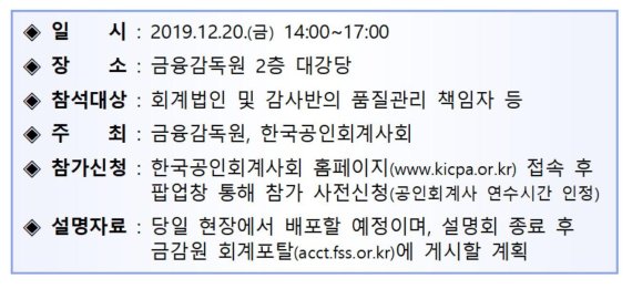 한국공인회계사회와 함께 개최하는 이번 설명회에서 금감원은 회계감독 현안 및 감독방향을 공유하고 기말감사시 유의사항을 안내함으로써 감사품질 제고를 유도할 방침이다.
