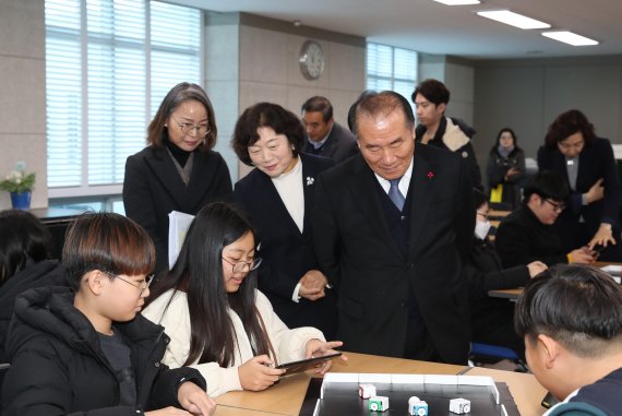 장휘국 광주광역시교육감과 이미라 광주교육연구정보원장이 19일 '광주SW교육지원센터' 개소식 참석 후 센터를 둘러보고 있다.사진=광주광역시교육청 제공