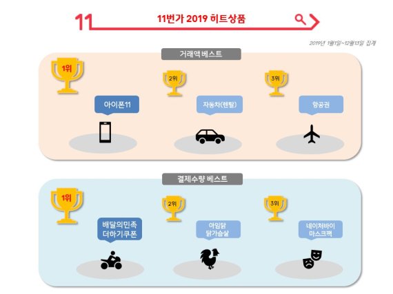 11번가는 2019년 누적 검색데이터와 판매데이터를 분석한 결과, 올해의 인기 검색어로 '배달의민족', '갤럭시버즈', '에어팟2'를 꼽았다. 올해 최고 인기상품은 결제거래액 기준으로 '아이폰11', 결제수량 기준으로 '배달의민족 더하기쿠폰'이었다.