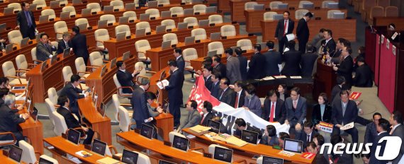 이날 한국당은 국회 본회의장을 점거하며 검찰개혁법 상정에 대한 물리적 시간끌기에도 나섰다.