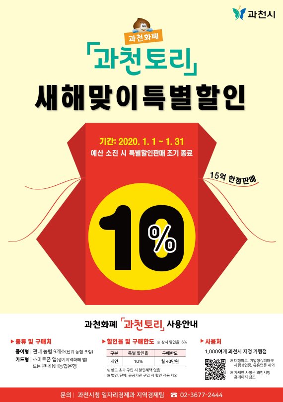 [과천=파이낸셜뉴스 강근주 기자] 과천시는 2020년 새해를 맞아 오는 1월1일부터 31일까지 과천화폐 ‘과천토리’를 10% 할인 판매한다. 특별할인 판매는 총 15억원 규모로 진행된다. 단, 기간 중에 예산이 소진될 경우에는 할인 판매가 조기 종료될 수 있다.