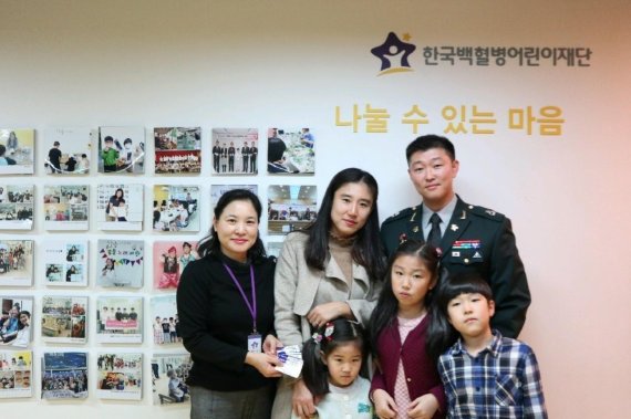 육군 53사단 코끼리연대 김재엽 소령이 가족들과 함께 한국백혈병어린이재단에 헌혈증서를 기부한 뒤, 사진을 찍고 있다. /사진=53사단