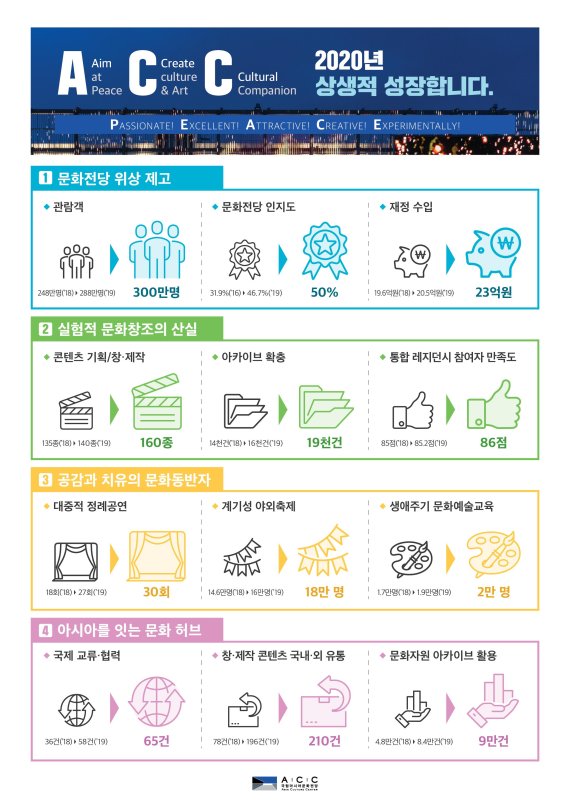 ACC는 3대 추진전략과 10대 중점과제 추진을 바탕으로 올해 △관람객 300만명(2019년 288만명) △인지도 50%(2019년 46.7%) △재정수입 23억원(2019년 20억 5000만원) △콘텐츠 창·제작 및 기획 160종(2019년 140종) △대중적 정례공연 30회(2019년 27회) △국제교류 65건(2019년 58건) 등의 목표를 달성할 계획이다.