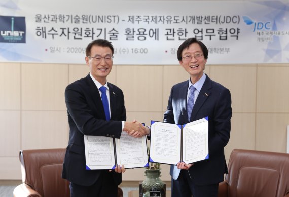 한편 이날 업무 협약식에는 UNIST 이용훈 총장, 김진영 연구처장, 김영식 센터장을 비롯한 해수자원화 연구센터 관계자들과 JDC 문대림 이사장, 정욱수 미래사업 단장, 현상철 환경사업 처장 등이 참석했다.