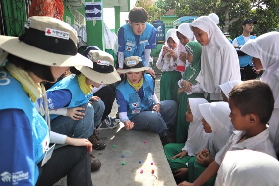 포스코 대학생봉사단 비욘드가 11일부터 20일까지 인도네시아 찔레곤에서 봉사활동을 펼쳤다. 봉사단원들이 쉬는 시간에 인도네시아 학생들과 공기놀이를 하고 있다.