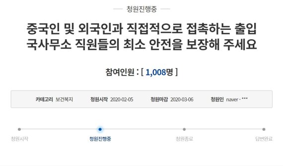 그러면서 "확산을 막고 공무원들이 위험으로부터 스스로를 지킬 수 있도록 출입국사무소 직원들에게도 방호복(방역복)을 지급해달라"고 청원했다.