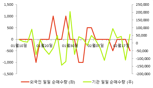 외국인 보유량 감소, 기관 증가 (5일 누적)최근 5일간 동종목의 외국인 투자자는 1,000주 순매도하였고 반면 기관은 57,167주 순매수하였다. 전날 외국인 500주 순매도, 기관57,167주 순매수하며 보유 비율이 변동했다.