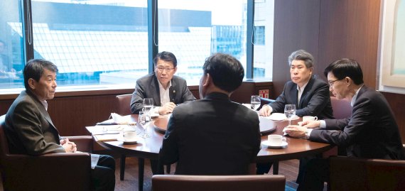 은성수 금융위원장(왼쪽 두번째)이 26일 서울 중구 은행연합회 뱅커스클럽에서 산업은행, 기업은행, 수출입은행 등 정책금융기관장들과 코로나19 피해기업 지원을 위한 간담회를 가졌다. 은 위원장은 "정책금융기관의 경영실적을 평가할 때 코로나19 지원에 따른 이익 감소분은 반영하지 않고, 지원노력은 가점을 반영하겠다"고 밝혔다.