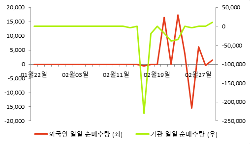 외국인 보유량 감소, 기관 증가 (5일 누적)최근 5일간 동종목의 외국인 투자자는 4,556주 순매도하였고 반면 기관은 10,800주 순매수하였다.