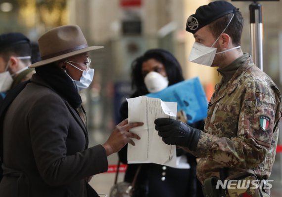 [밀라노=AP/뉴시스]지난 9일(현지시간) 이탈리아 경찰과 군인들이 밀라노 주요 기차역에서 출발하는 승객들을 점검하고 있다. 주세페 콘테 이탈리아 총리는 신종 코로나바이러스 감염증(코로나19) 누적 확진자 수가 1만 명에 육박하자 ' 10일부터 북부 지역에 한했던 일명 '레드존(적색지대·봉쇄)' 조치를 이탈리아 전역으로 확대한다'라고 밝혔다. 이에 따라 이탈리아 인구 6000만 명의 이동이 엄격하게 제한되며 긴급한 상황이 아니면 거주지역을 떠날 수 없게 됐다. 이동이 필요할 경우 경찰, 혹은 군에 자신의 이동 계획을 밝혀야 하며 이는 다음 달 3일까지 효력을 발휘한다. 2020.03.10. /사진=뉴시스