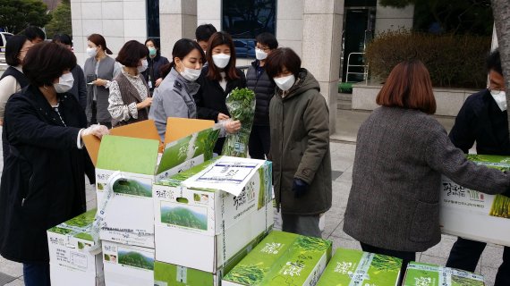 대구농협이 대구지방경찰청에서 '코로나19' 극복을 위해 미나리 팔아주기 소비촉진행사를 펼쳤다. 사진=대구농협 제공