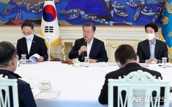 [서울=뉴시스]배훈식 기자 = 문재인 대통령이 18일 청와대에서 열린 코로나19 대응 논의를 위한 경제주체 원탁회의에 참석해 발언하고 있다. 2020.03.18. dahora83@newsis.com <저작권자ⓒ 공감언론 뉴시스통신사. 무단전재-재배포 금지.> /사진=뉴시스화상