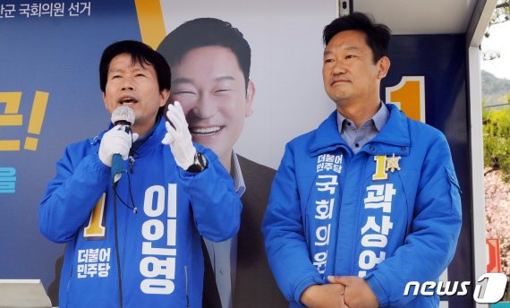 더불어민주당 이인영 원내대표가 13일 충북 괴산 장날을 맞아 동남4군(보은·옥천·영동·괴산)에 출마한 곽상언 후보 지원유세를 하고 있다