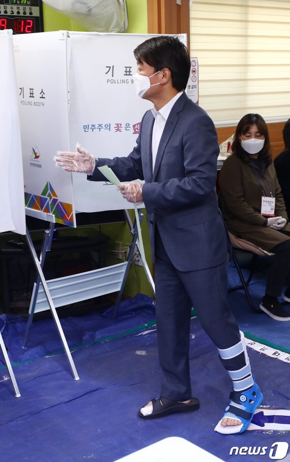 안철수 국민의당 대표가 제21대 국회의원 선거일인 15일 오전 서울 노원구 상계1동 제7투표소에서 마라톤 여파로 반깁스를 한 채 투표하고 있다. /사진=뉴스1