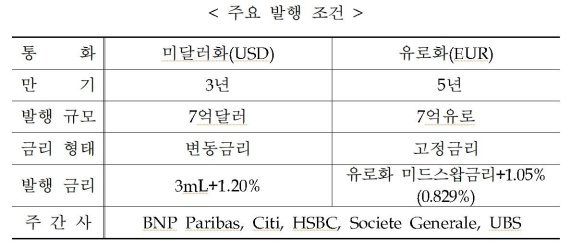이 중 유로화 채권은 그린본드이며, 코로나19 확산 이후 한국계 기관이 발행한 첫 유로화 채권이다.
